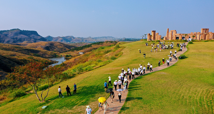 巨石陣由經(jīng)過切割的丹霞原石堆砌而成,門形石陣與水中嬌艷的荷花相互輝映,充滿了神秘而獨特的美感。在這里,建議穿著純色長裙,穿梭于石拱門之間,利用光影的變幻營造出神秘而迷人的氛圍,隨手一拍都是大片。夏季傍晚時分,這里還常有民俗表演,火把巡游的熱烈與丹霞夜景的靜謐相結(jié)合,氛圍感直接拉滿。