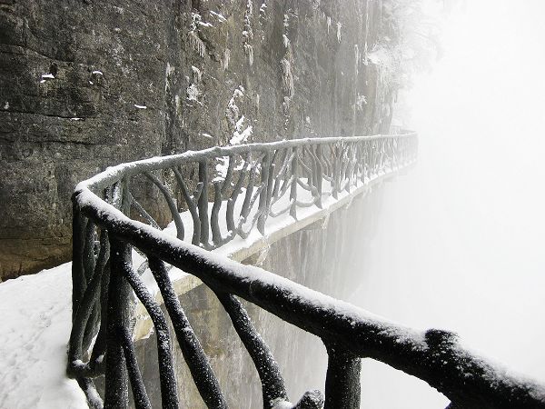 順著路一直走走拍拍,連不愛照相的俺都忍不住吆喝著來一張來一張。俺兄弟一邊拍一邊不惜余力地打擊俺:您老就別糟踐這美景了。走在鬼谷棧道,一側(cè)是山壁,一側(cè)是霧氣籠罩的懸崖,后來又下起雪來,真有點(diǎn)深山求仙的味道。其實(shí)一路走來并不累,就是總不得不從被冰掛壓倒的樹下鉆身而過,累得腰酸。再有就是俺一度說要雪盲了,眼睛都有點(diǎn)發(fā)花。最后終于到了頂端的天門山寺。確實(shí)要承認(rèn),在這樣的一番情景之下,佛性也顯得格外深沉,連那個向來不信的家伙也雙手合十。本來還想隨喜瞻仰一下佛祖真身舍利的,可被那個賣票的痞子樣給雷到而作罷。