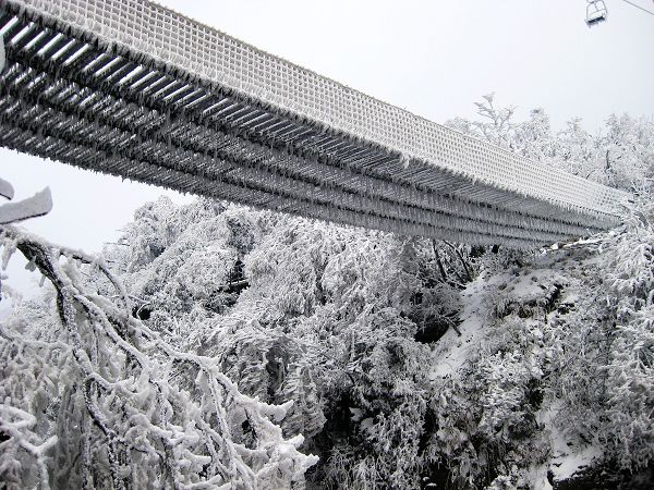 由于淡季,不用排隊(duì)很快坐上了索道,前前后后的轎廂內(nèi)都沒人,俺倆坐著好不優(yōu)哉。索道漸次翻越而后陡然爬升,進(jìn)入乳白色的氤氳之中,最后全被濃厚的霧氣包裹,像在云霧中漂移。俺又爽又驚,心想神仙還真不是好當(dāng)?shù)???粗懊娴牟僮髡f明:沒事,這個挺先進(jìn)的,碰到惡劣天氣會自動停止運(yùn)行。話音剛落,它就停了,然后左右左右的晃啊晃啊。俺顫顫地問:怕嗎?他說:嗯……還,還成。俺喃喃地道:靠,俺可不想死呢……終于正襟危坐地熬過了那幾分鐘的晃悠,繼續(xù)上行后,霧氣淡了許多,這才看到索道支架和輪軌竟然都凍上厚厚的冰掛。心肝一顫:不是吧,這是到哪了?。?!