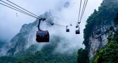 天門山山頂森林觀光纜車,纜車以天門山主峰云夢仙頂為起點,以天門山寺前櫻桃灣廣場為終點,總長度為800米,單程運行約10分鐘,為無遮蓋的雙人吊椅式,每小時運力可達(dá)600人。